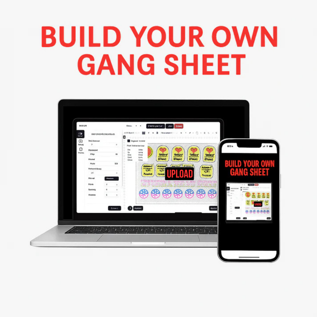 Choose one of the two options below to get started. You can either upload your ready-to-print file or build your custom gang sheet using our Gang Sheet Builder. Please select the method that best suits your needs:
